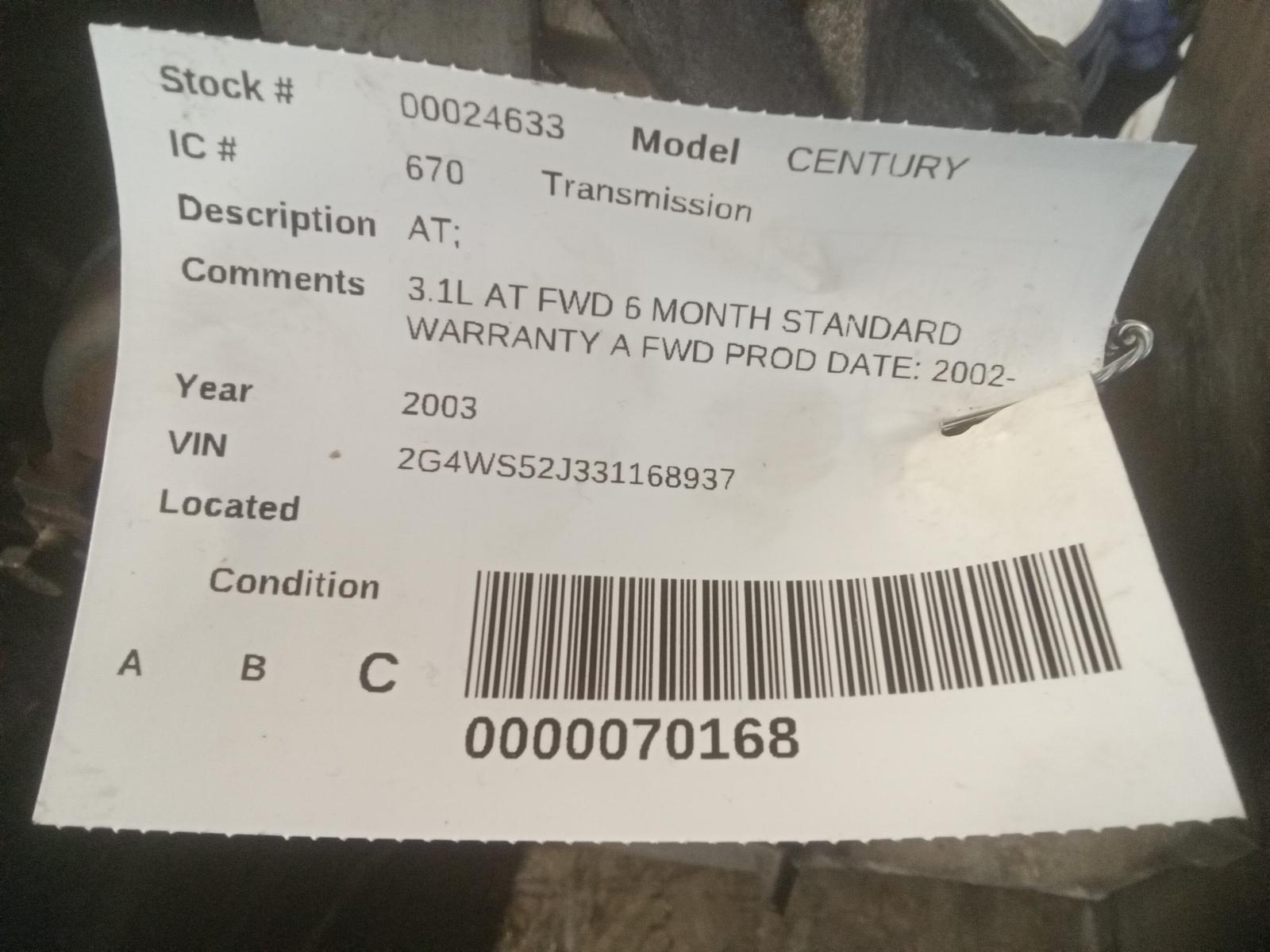 2003 BUICK CENTURY Part:400 Transmission 3.1L AT FWD 6 MONTH STANDARD WARRANTY A FWD PROD D 03 AT; 296618