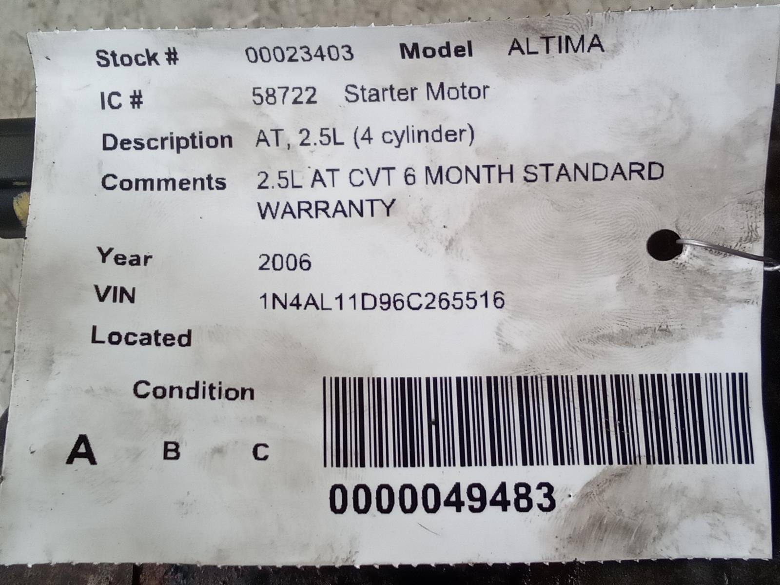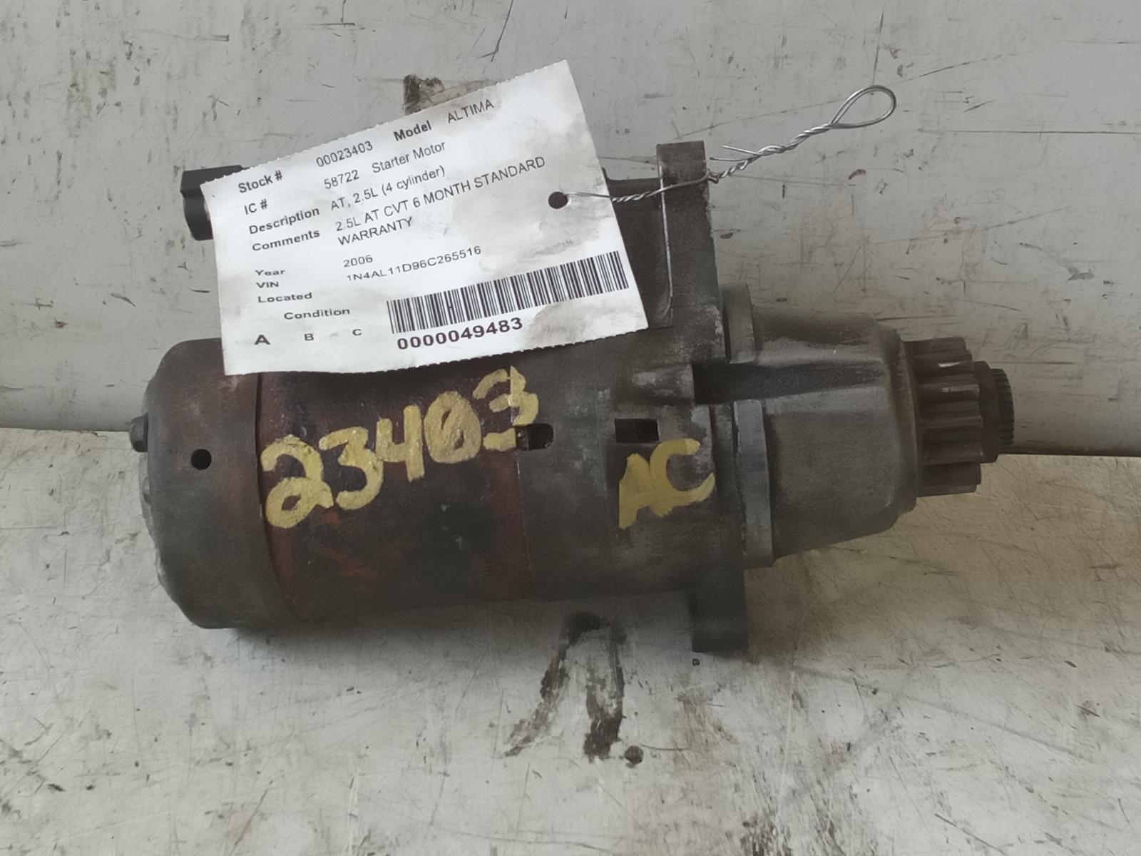 2006 NISSAN ALTIMA Part:604 Starter Motor 2.5L AT CVT 6 MONTH STANDARD WARRANTY 2.50L PROD D 02-06 AT 2.5L (4 Cylinder) 223310