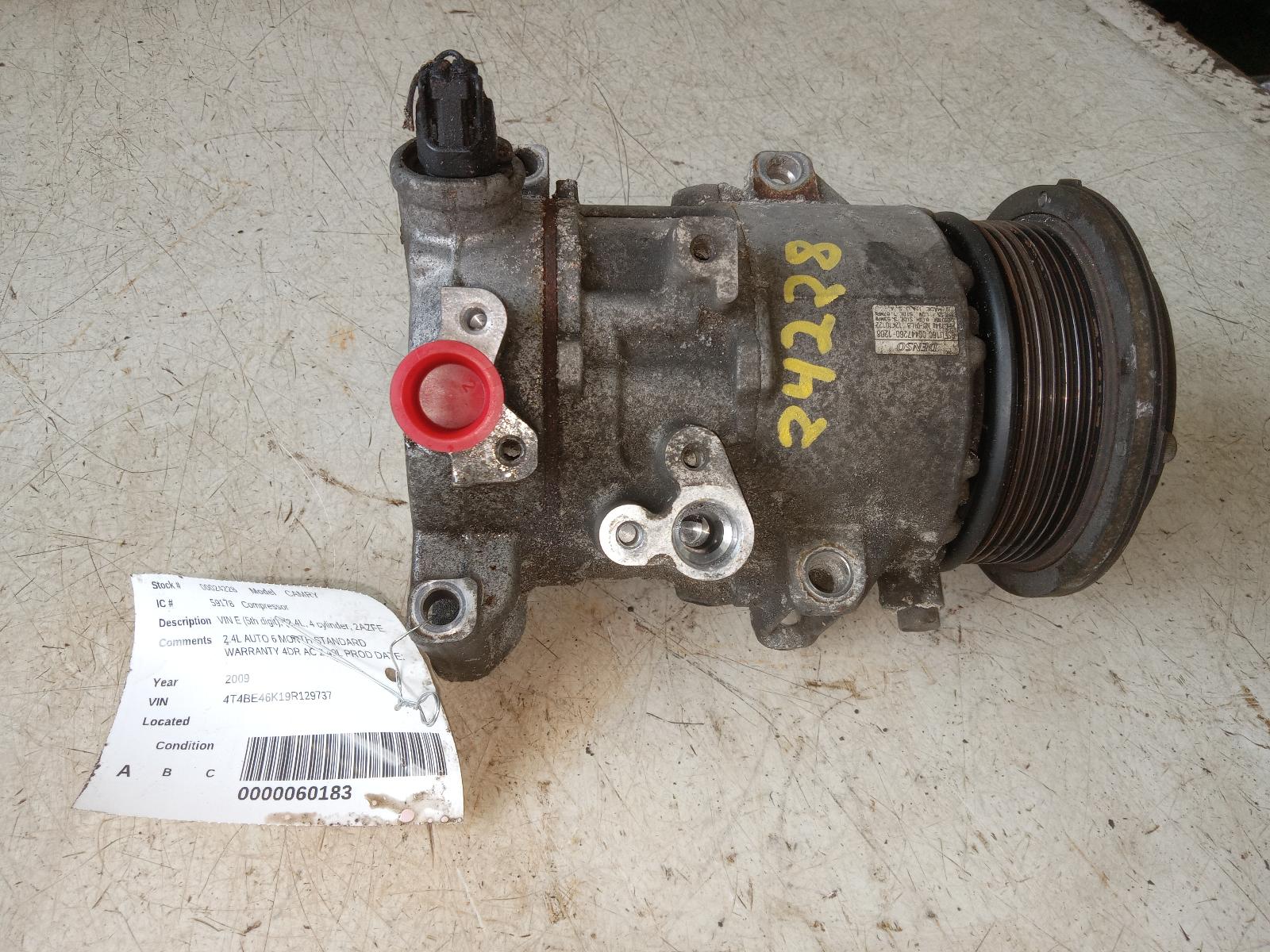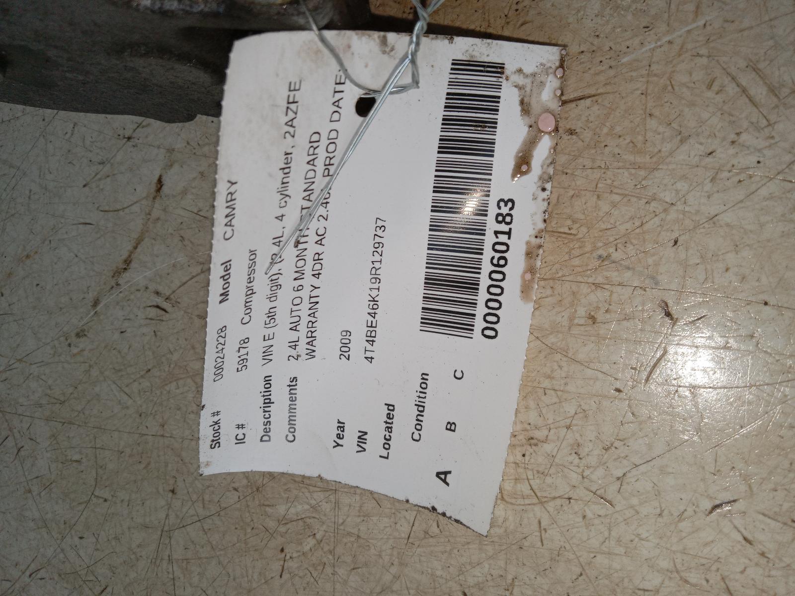 2009 TOYOTA CAMRY Part:682 AC Compressor 2.4L AUTO 6 MONTH STANDARD WARRANTY 4DR AC 2.40L P 07-09 VIN E (5th Digit) (2.4L 4 Cylinder 2AZFE Engine) North America Built 262093