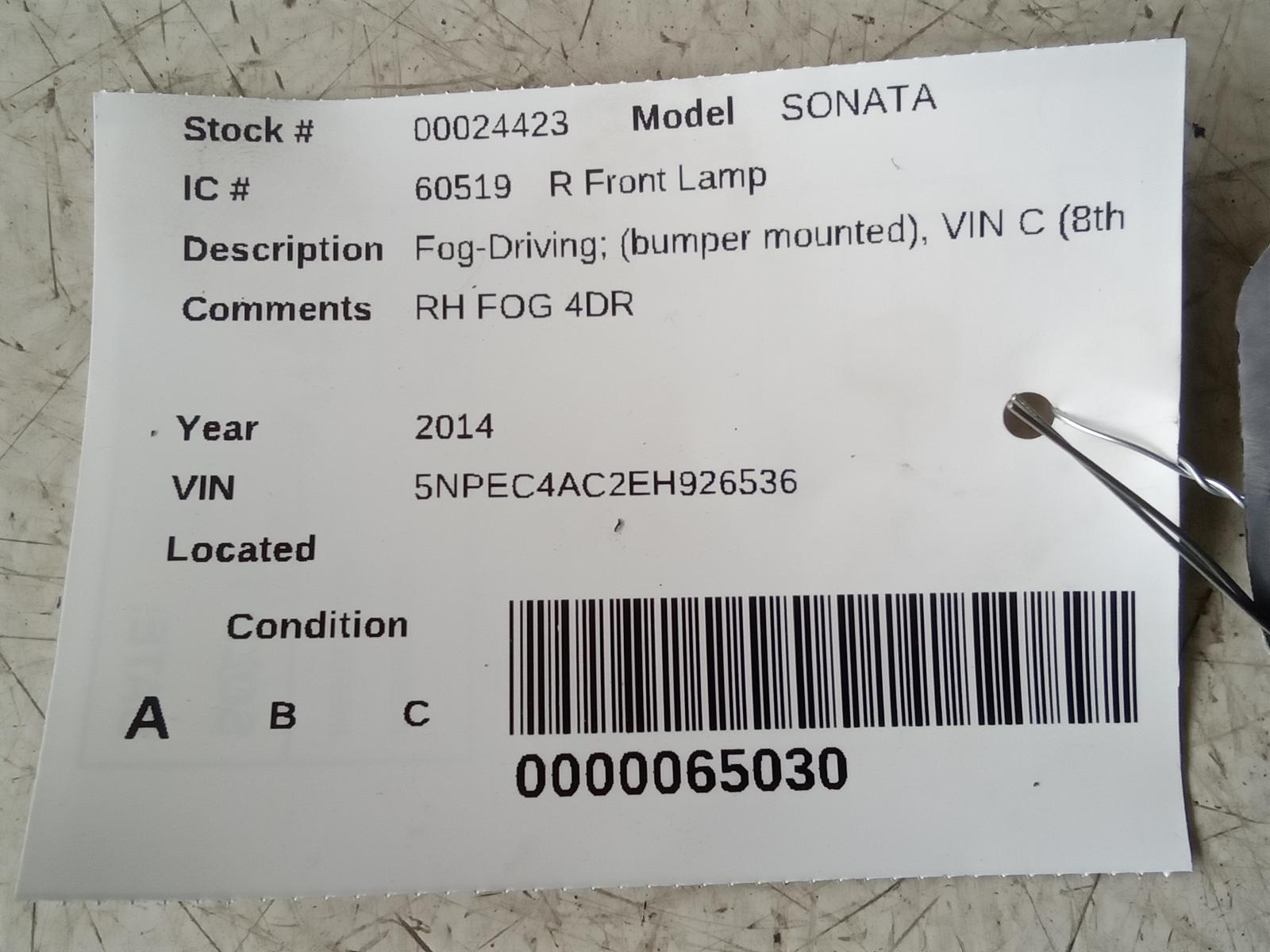 2014 HYUNDAI SONATA 14 Fog-Driving; (bumper Mounted) VIN C (8th Digit) R. Front Lamp
