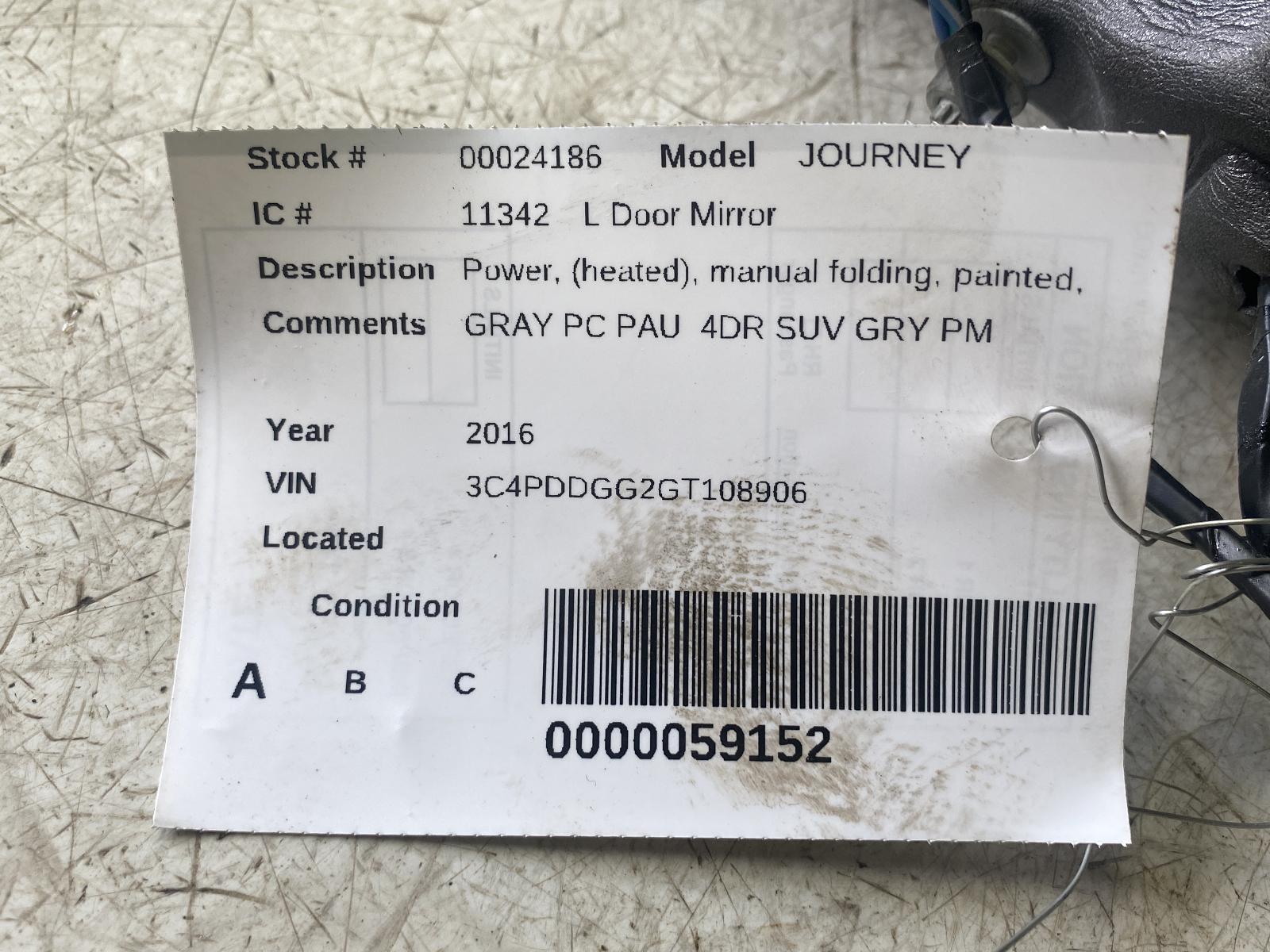 2016 DODGE JOURNEY Part:128 Side View Mirror GRAY PC PAU 4DR SUV GRY PM 17-20 (power) (heated) Manual Folding Painted Opt JPD (one Touch Down Window) L. 258306