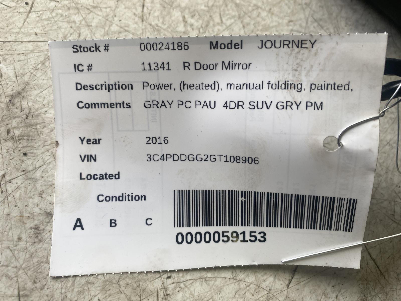 2016 DODGE JOURNEY Part:128 Side View Mirror GRAY PC PAU 4DR SUV GRY PM 17-20 (power) (heated) Manual Folding Painted Opt JPD (one Touch Down Window) R. 258313