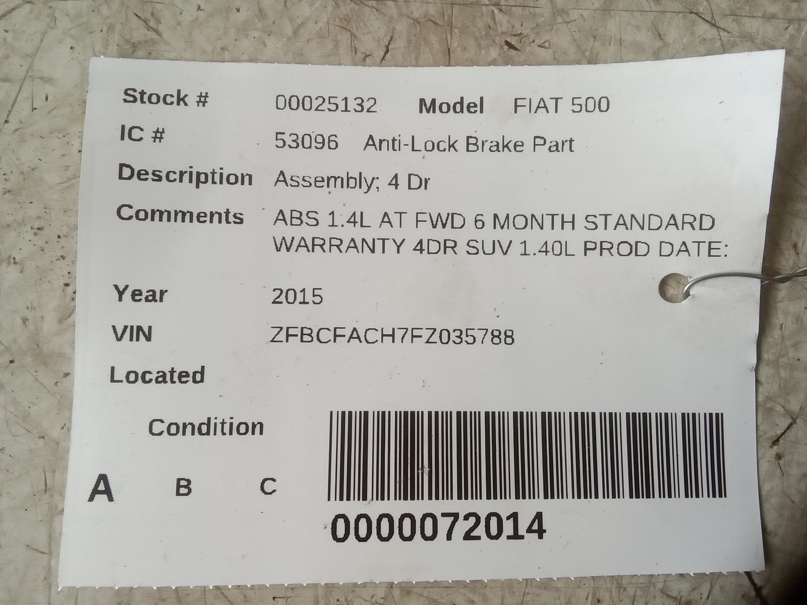 FIAT FIAT 500 2014 2015 Assembly; 4 Dr Part:545 Anti Lock Brake Parts ABS 1.4L AT FWD 6 MONTH STANDARD WARRANTY 4DR SUV