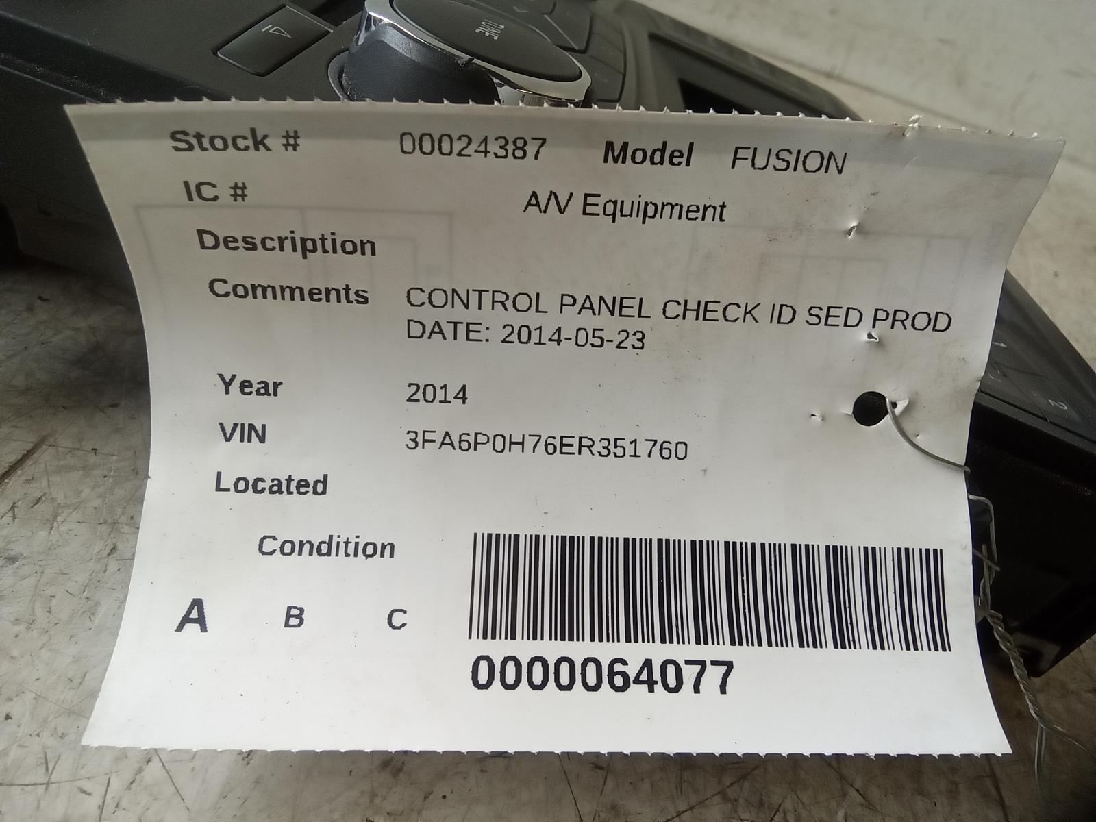 FORD FUSION 2014 2015 Control Panel, ID ES7T-18E243-EB Part:638 Radio Audio CONTROL PANEL SED PROD DATE: 2014-05-23
