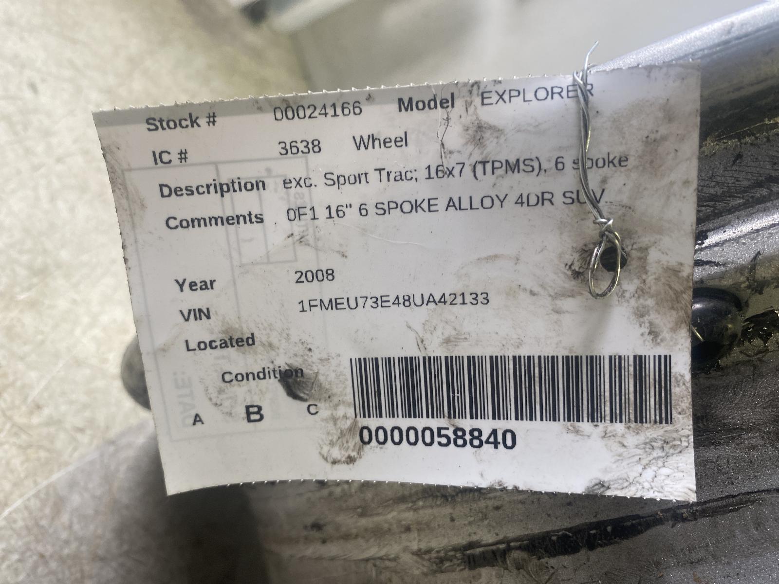 FORD EXPLORER 2007 2008 2009 2010 Exc. Sport Trac; 16×7 (TPMS), 6 Spoke (aluminum, Flat Grooves) Part:560 Wheel 0F1 16 6 SPOKE ALLOY 4DR SUV