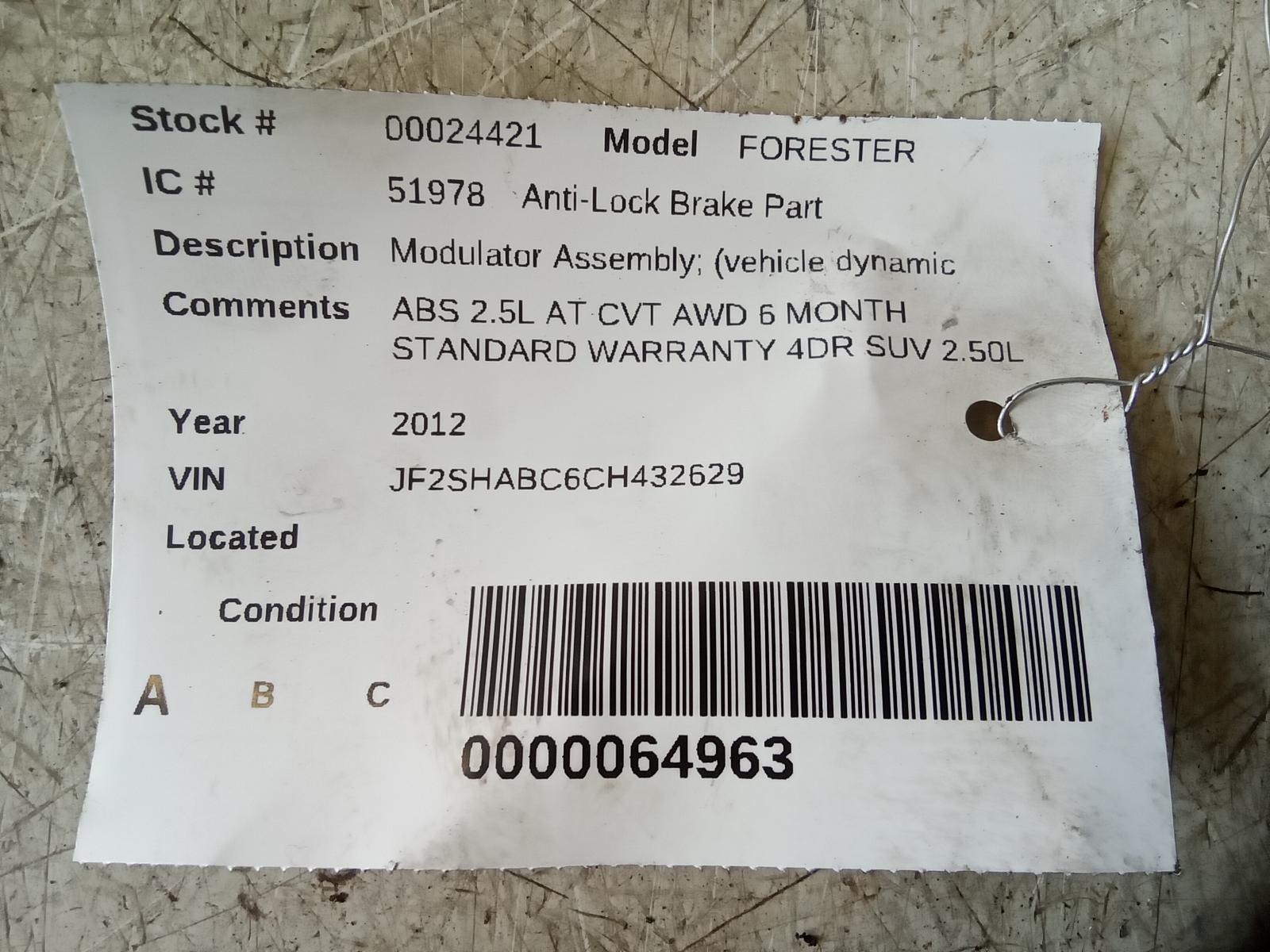 SUBARU FORESTER 2011 2012 2013 Modulator Assembly; (vehicle Dynamic Control), AT Part:545 Anti Lock Brake Parts ABS 2.5L AT CVT AWD 6 MONTH STANDARD WARRANTY 4DR