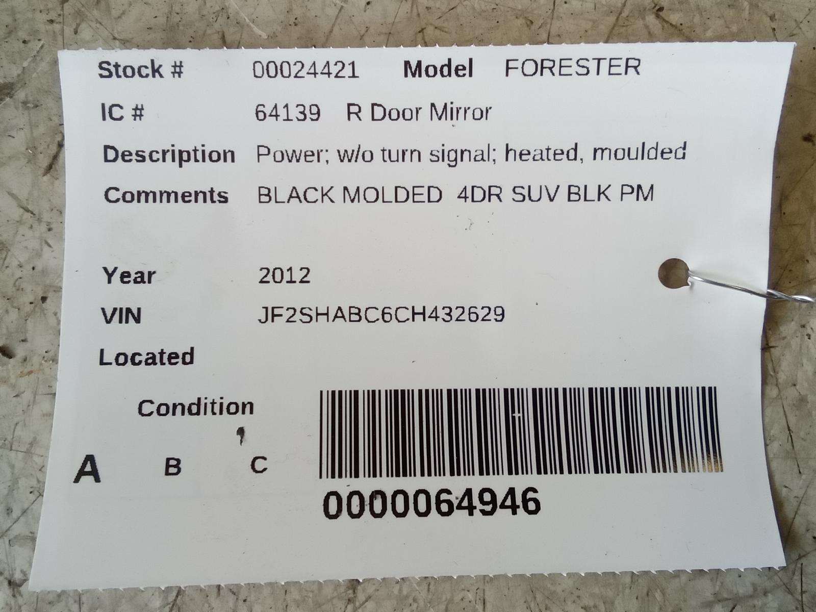 SUBARU FORESTER 2011 2012 2013 Power; W/o Turn Signal; Heated, Moulded Black, R. Part:128 Side View Mirror BLACK MOLDED 4DR SUV BLK PM